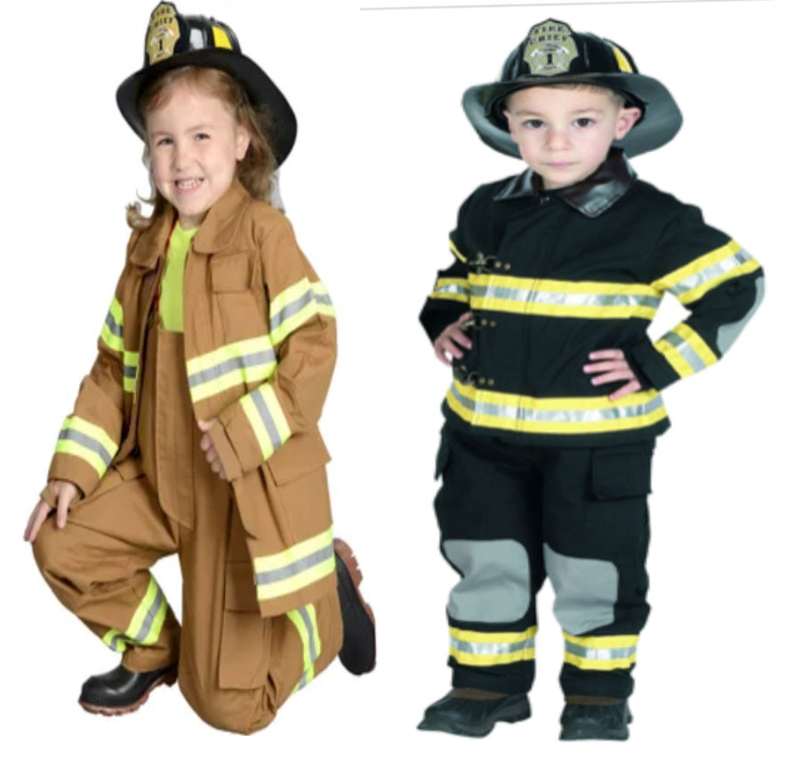 Item includes fire coat, bunker style pants with suspenders, helmet and heat transferred names. Sized 2-3, 4-6, 6-8, 8-10 and 12-14. Black and tan outfits have red suspenders. Note - picture shows metal snap front closures. These have been replaced with zippers and Velcro front closure on some sizes. NOTE- 12-14 is AVAILABLE IN TAN ONLY, but is SOLD OUT at this time.