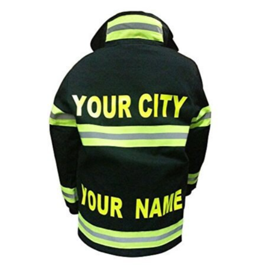 COMPLETE with HELMET, coat, pants with suspenders. Each outfit can be personalized on the top and / or bottom of the coat. The child's name and or fire department name using white letters.