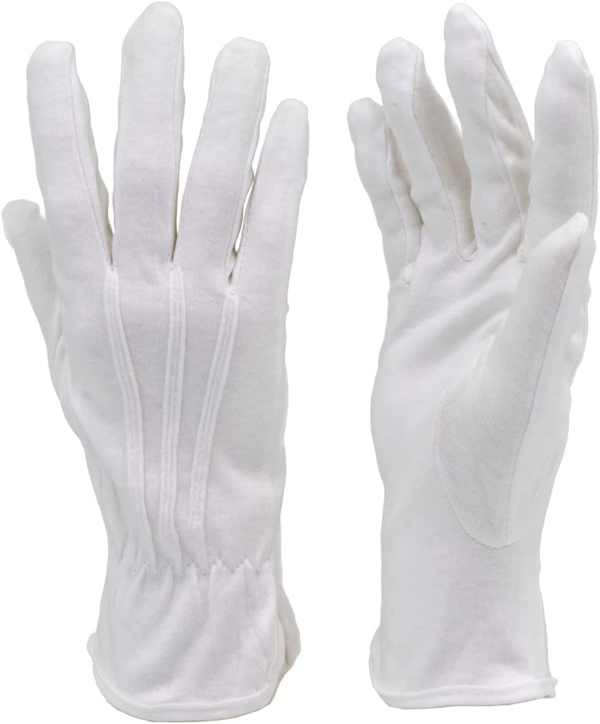 White Dress gloves - Sold as a pair- One Size fits most. Made of nylon. Also used as Santa Suit gloves